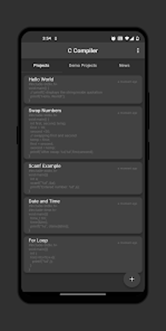 Además, C Compiler ofrece un layout de herramientas que permite acceder a atajos esenciales como copiar, pegar y compartir, junto con una navegación fluida para mover el cursor con facilidad. La función de escaneo de código permite importar fragmentos directamente desde libros o documentos impresos. Con secciones de tutoriales y noticias, los usuarios pueden mantenerse al día con las últimas tendencias de desarrollo, mientras que las herramientas de gestión de proyectos facilitan la organización de su trabajo.
